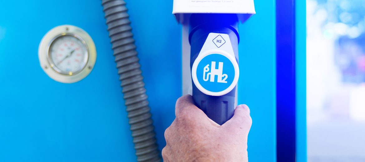 Man hold a fuel dispenser with hydrogen logo on gas station. h2 combustion engine for emission free ecofriendly transport.