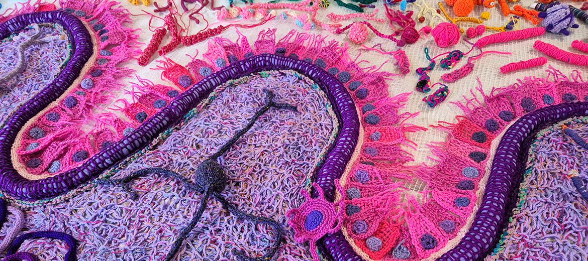 Background image by Adam Humenick: nerve fibres (bright pink) in gut villi. Surface textile artwork by Pat Pillai.