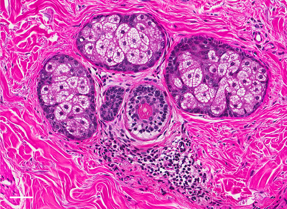 Bad hair day? Grease factories are at work in your skin. Three sebaceous glands surround the hair follicle and will empty their greasy globules (white) onto the hair – the round pink thing in the centre of the follicle. Looking at tissue stained like this is the basis of a lot of clinical histology, where diseases are diagnosed and students learn what the microscopic structures in tissues look like.