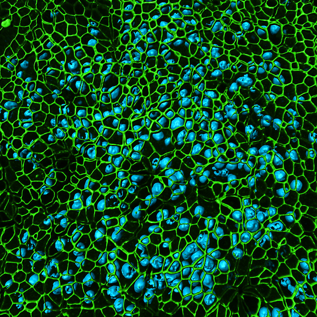 Cultured cells from the trachea of a child with asthma. Cell nuclei are stained blue. The green rings show tight junctions that attach the cells to each other and form a physical barrier, protecting tissues from airborne particles like pollen and bacteria. The tight junctions shown here appear to be compromised after infection with the common cold virus. This would make the barrier less effective.