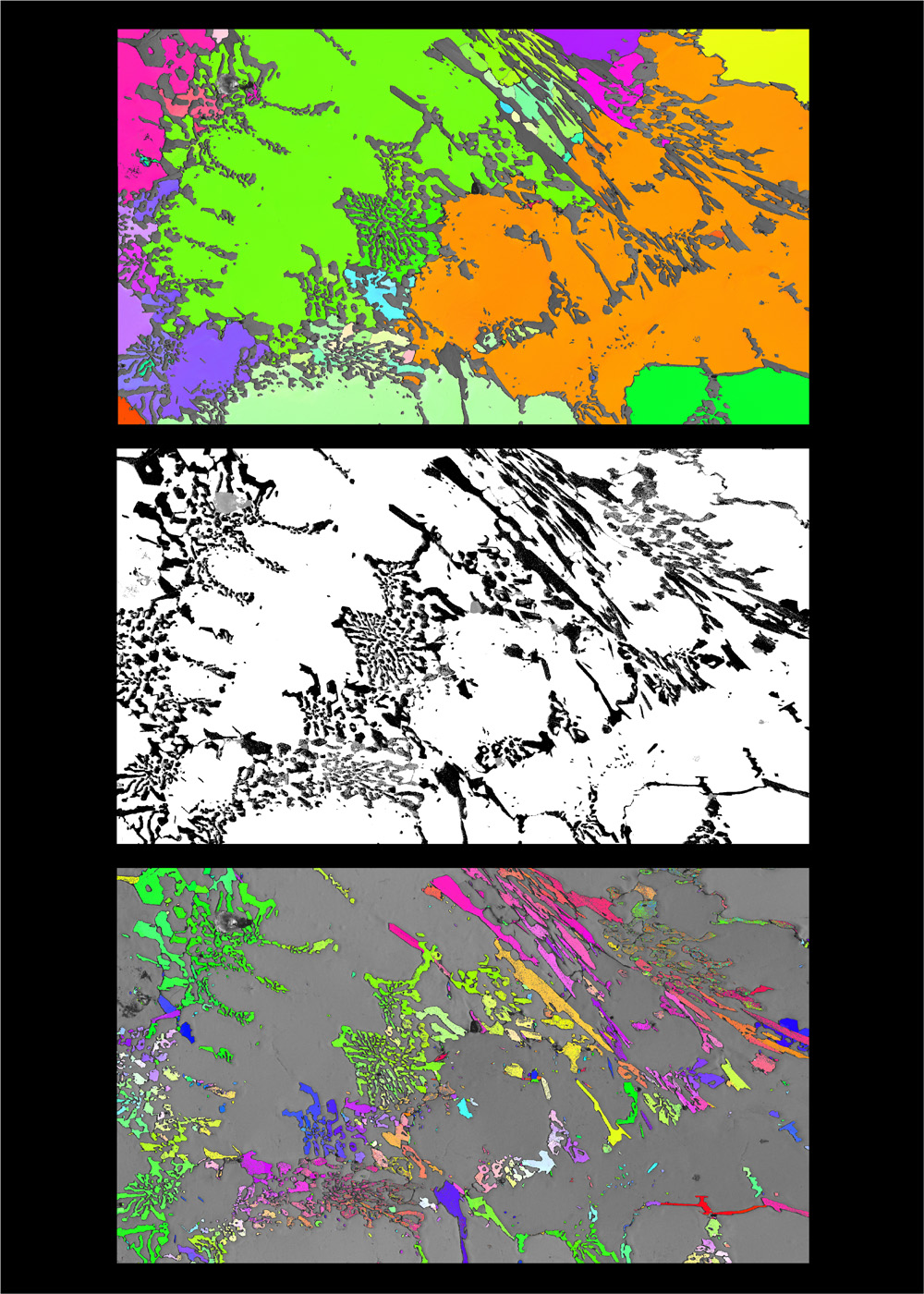 Crystals in an innovative super-hard cast iron. White and black show regions of different chemical composition within the iron. The adjacent images show the orientation of the crystals in the white region (top) and the black region (bottom).