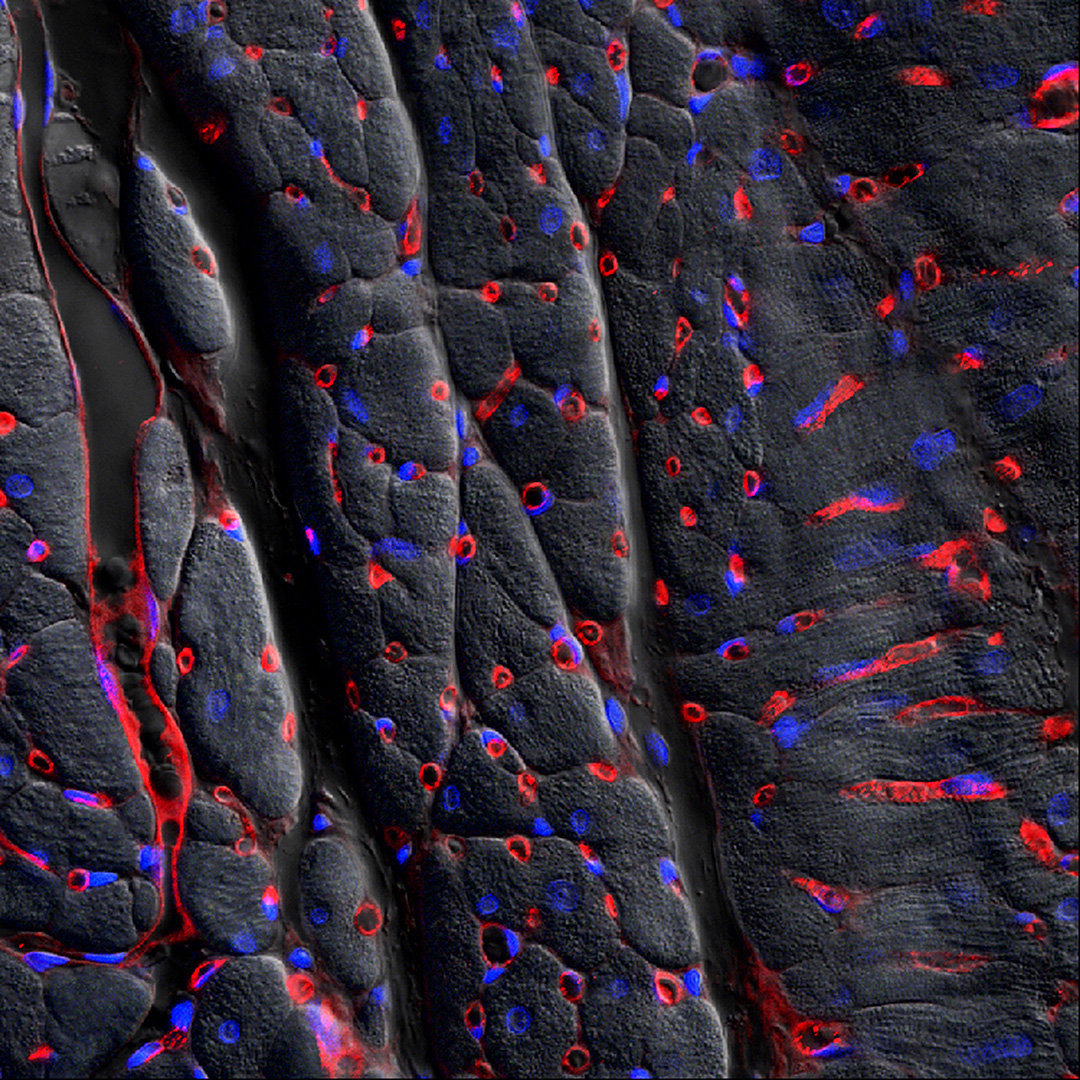 Red areas are cells that line capillaries feeding the heart muscle (the dark background area). The blue dots are cell nuclei.
