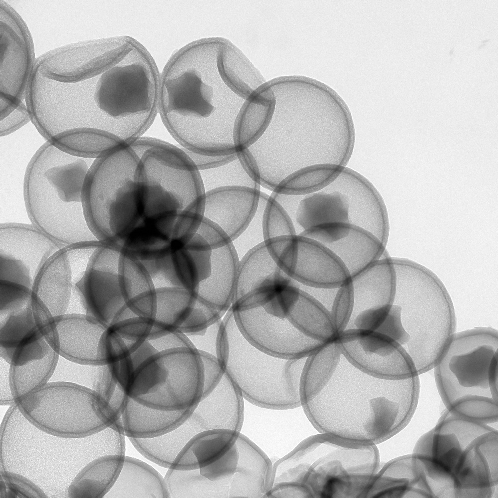 Hollow silica nano-spheres being developed for drug delivery. The drug seeps into the spheres through pores in the silica, which will then be blocked until they are ready to be opened inside the patient’s body.