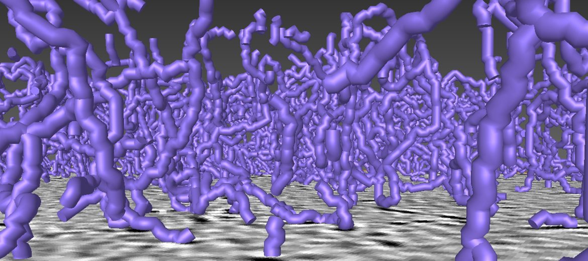 3D tomographic reconstruction of hydrogel fibre bundles 1.8–2.4nm thick (purple), each comprising three or four aligned polysaccharide molecules.