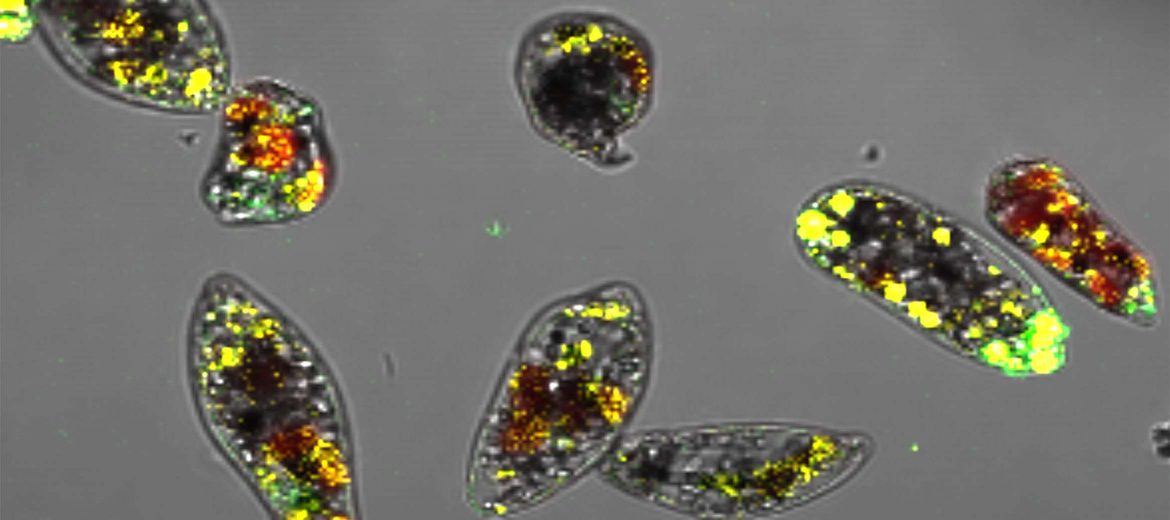 Brightfield image of microalgae cells highlighting different components including lipids (yellow).