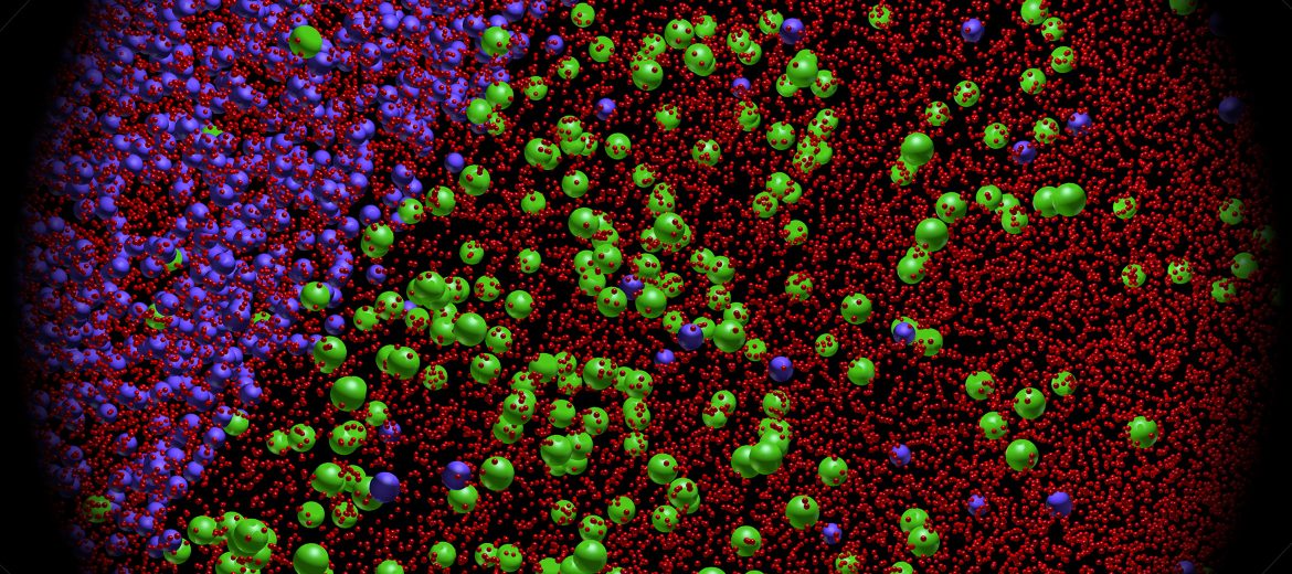 Atoms in the 3D-printed titanium alloy showing two distinct segments: the ductile low oxygen segment and the stronger high oxygen segment. The image is adapted from atom probe tomography (APT) data from Microscopy Australia’s University of Sydney facility revealing oxygen atoms (green) partitioned to the alpha phase, and iron atoms (blue) partitioned to the beta phase. Atomic sizes are arbitrary.