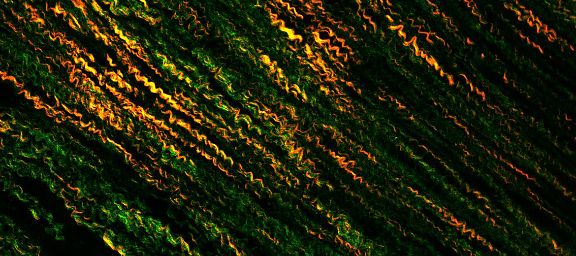 Second harmonic generation micrograph by Dr Rob Hume shows a scar in a pig's heart caused by an induced heart attack. Treatment with rhPDGF-AB has improved the alignment of collagen fibres.