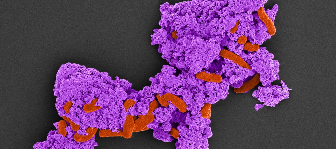 Colour enhanced scanning electron microscope image of E. coli (orange) surrounded by polyethylenimine and carbon nitride (purple)