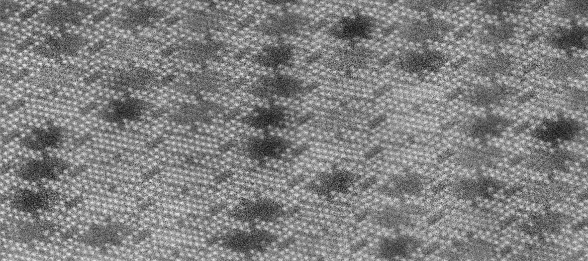 Scanning transmission electron micrograph showing the atomic arrangement in the new mineral. Heavier elements show up as darker dots.