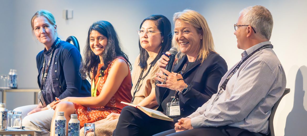 Nathalie Gaudreault (Allen Institute for Cell Science), Aastha Mathur (Euro-BioImaging), Tomomi Shimogori (RIKEN Center for Brain Science), Hilary Hanahoe (Research Data Alliance), and Joe Shapter (Australian Research Infrastructure Advisory Committee) contributing to a panel session on what drives success in community-led solutions.