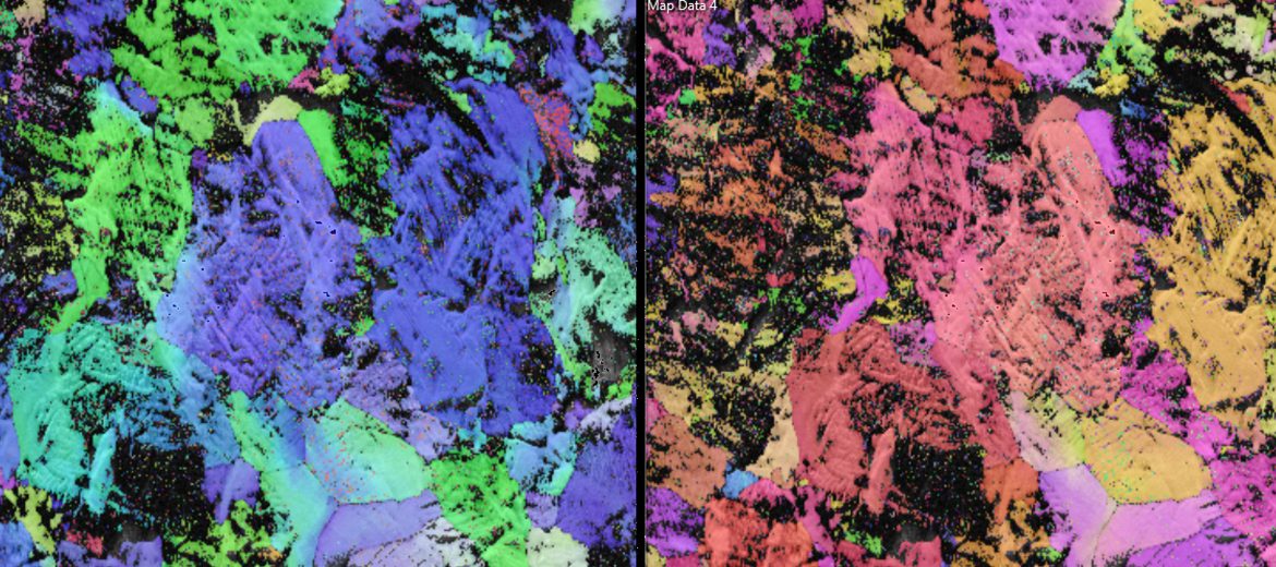 Electron Backscatter Diffraction image showing crystal orientations in a Gelion current collector.