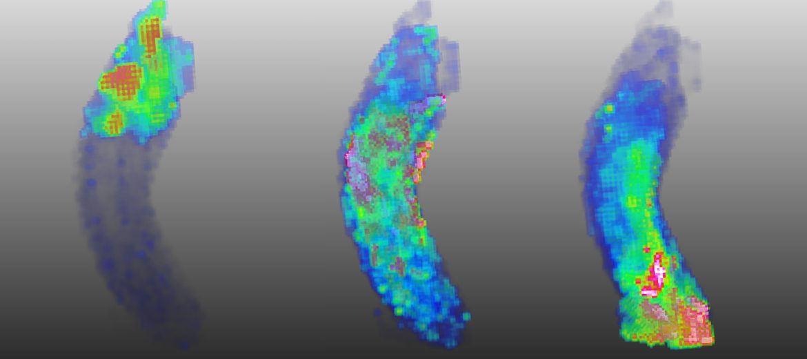 3D imaging mass spectroscopy of a centipede venom gland showing different distribution of various toxins along its axis.