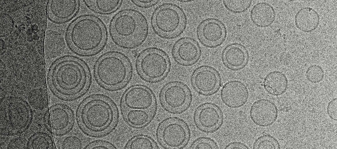 Cryogenic transmission electron microscope image of cannabinoid-containing liposomes imaged for Little Green Pharma