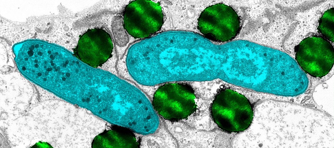 Electron micrograph showing lipid droplets, dark circular structures coloured green, interacting with invading bacteria, coloured blue, in a macrophage.