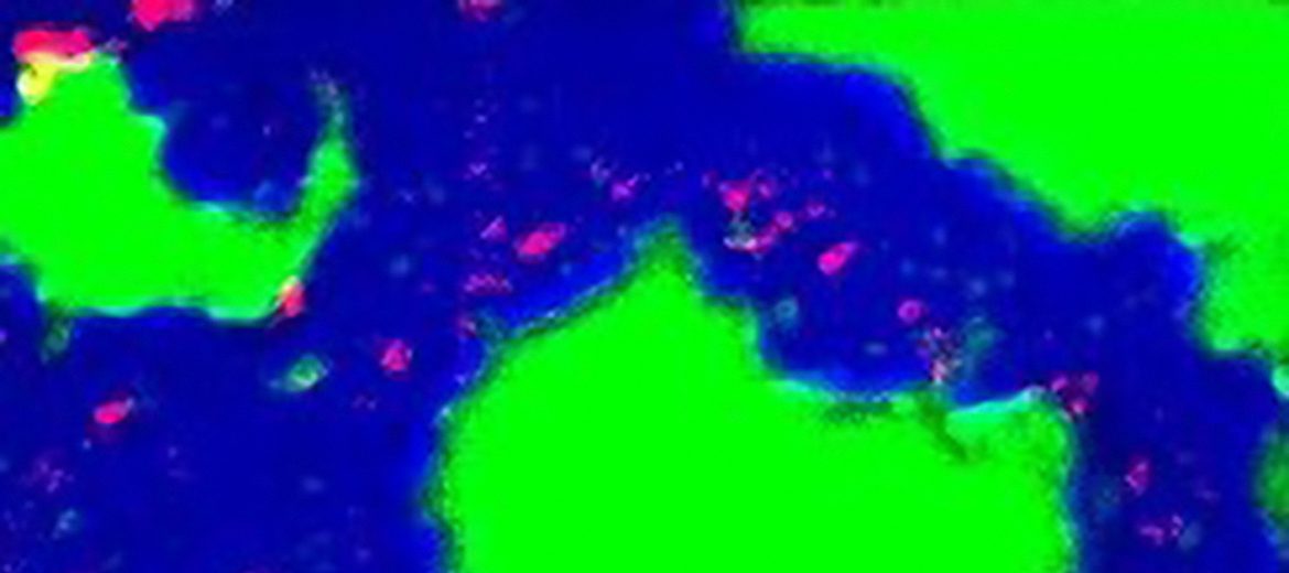 NanoSIMS ion image of a 1900 million-year-old pyritic Huroniospora microfossil: sulfur is blue; oxygen, representing quartz, is green; and nitrogen, pink. The discontinuous ring of nitrogen is interpreted as a chemical ghost of the original organic microfossil wall.