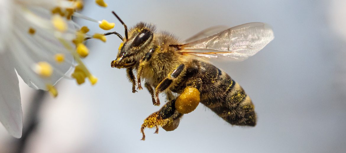 A bee collects honey from a flower.