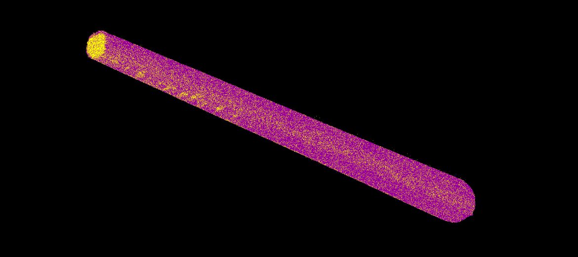 APT image of a nanowire showing the gallium atoms in yellow and the indium atoms in purple.