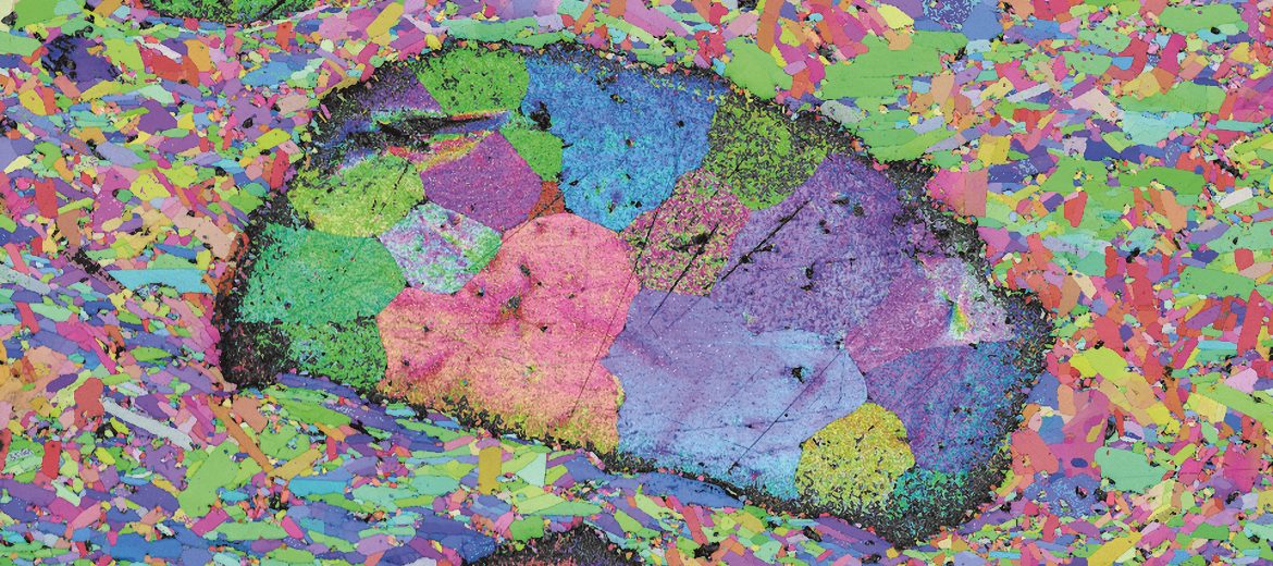 Electron back scatter diffraction image of the fabricated ceramic composite. The colour of each grain indicates its orientation in the substrate. The pore in the centre of the image is completely filled with larger aluminium grains.