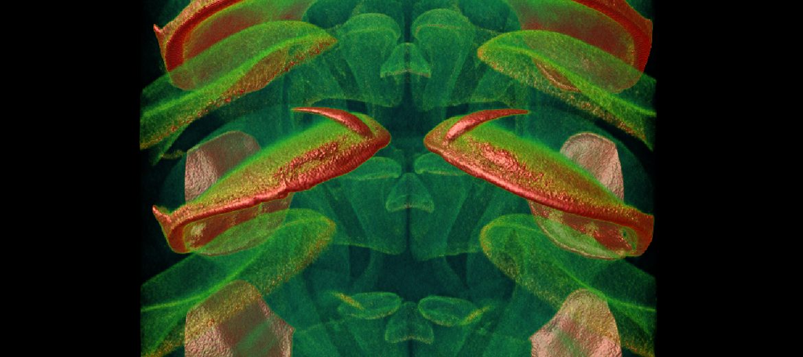 Dr Jeremy Shaw is studying chiton teeth – a very strong natural composite material. He used transmission electron microscopy (TEM) for structural studies and energy-filtered elemental mapping at high magnification, along with scanning electron microscopy (SEM) and elemental analysis (EDS) at the tissue level. Focused ion beam (FIB) milling was used to extract small slices from selected areas of the tooth for diffraction studies. X-ray nano- and micro-tomography revealed the 3D structure of the teeth. Together these techniques give insights into the process that forms this tough biomineralised, iron-reinforced material at ambient temperatures.