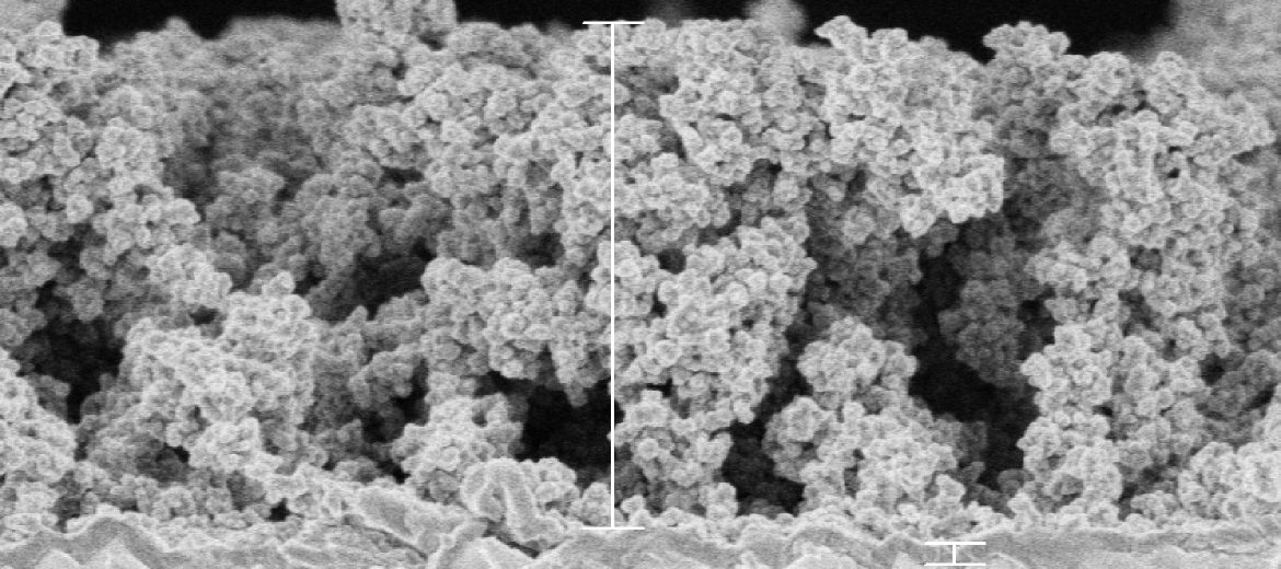 Scanning electron micrograph of titanium dioxide fabricated with flame spray pyrolysis, used for making perovskite solar cells.