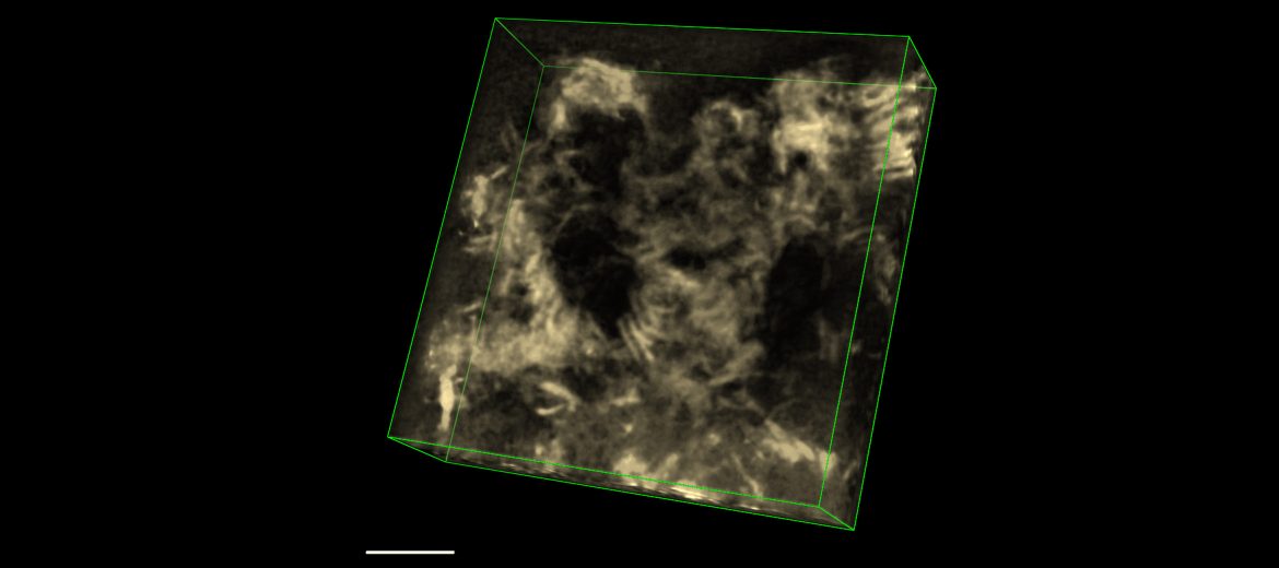 3D electron tomography image showing rod-shaped cavin assemblies. Scan the QR code to see a tilt series of cavin rods.