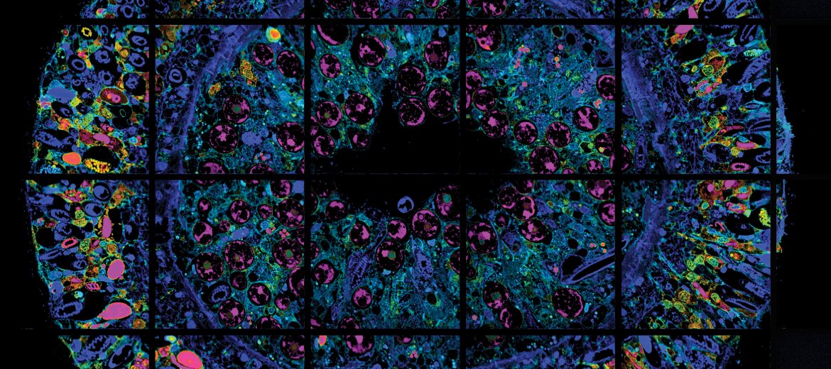 NanoSIMS image of a cross section of an anemone. In the outer layer are the stinging nematocysts with their coiled barbs (purple). The inner layer contains mainly symbiotic algae (round and pink).