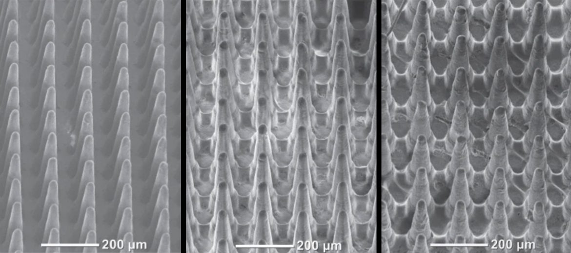 SEM images of a an uncoated HD-MAP (left), HD-MAP coated with the dengue vaccine (centre), HD-MAP post application (right). Reproduced from npj Vaccines 6, 66 (2021). DOI: 10.1038/s41541-021-00328-1