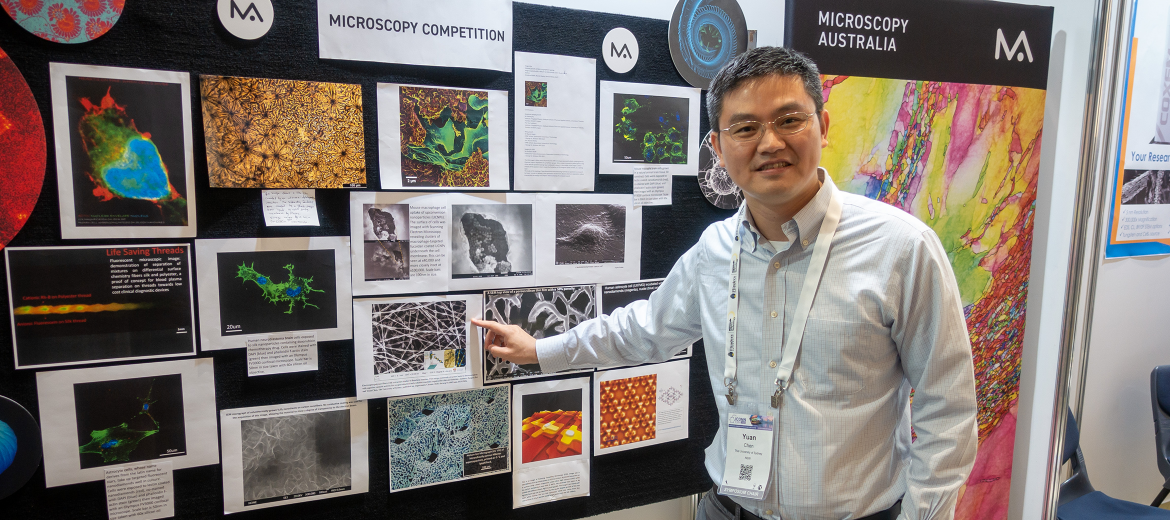 The first prize went to Prof. Yuan Chen from the University of Sydney for his SEM image of electrospun polymer fibres taken as part of his research into batteries for flexible electronics. Read more about his research.
