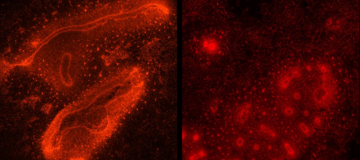 Fluorescence microscopy image showing altered structures formed by iPSCs from human cells containing a normal copy of the Pcdh19 gene, left, and cells with a disease-causing version of Pcdh19, right.