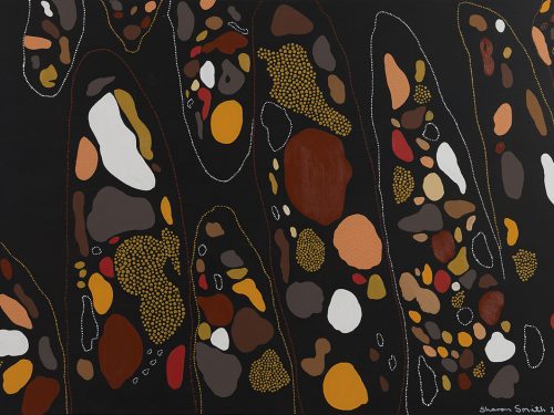The painting is about our people connecting to the land and water and how they traveled from place to place. The circles are my interpretation of each clan and how they travel teaching culture.