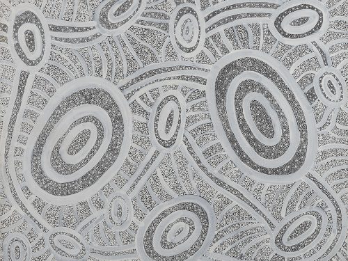 Warlpiri people perform a young men’s initiation ceremony, which involves the Janganpa Jukurrpa. The Janganpa Jukurrpa belongs to Jakamarra/Jupurrurla men and Nakamarra/Napurrurla women. In Warlpiri paintings, traditional iconography is used to represent this Jukurrpa. Concentric circles are used to depict the trees in which the ‘janganpa’ live, and also the sites at Mawurrji.