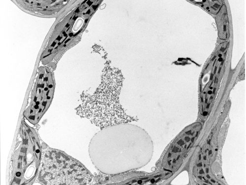 The chloroplasts are the dome-shaped structures clinging to the inner edge of the cell. The dark squarish shapes are the stacked-up membranes that capture light from the sun and turn it into sugars that fuel plant growth and ultimately all life on earth. These sugars are stored as starch granules – the white bean-like shapes inside the chloroplasts.