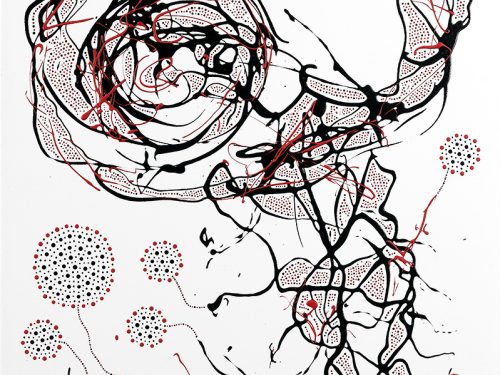 This painting is about the way our atoms and cells resonate with our surrounding environment. The atoms and cells of someone who is Indigenous may resonate quite differently to someone who is not. The focus of my work is love and to be aware of humanities footprint on this green and beautiful world. 100 years from now I don’t want my children’s children to wander in a world made of concrete, steel and dirt depleted of wildlife and farmable land. I want them to wander free in a vibrant wilderness. Mankind is doing life wrong, we need to take a few pages from the book of our Indigenous ancestors and live with this strange and beautiful world instead of against it.