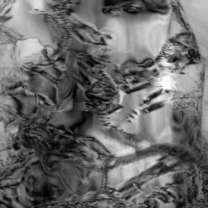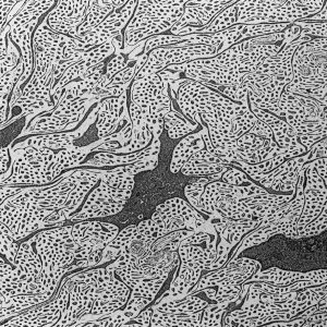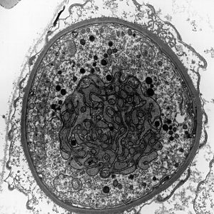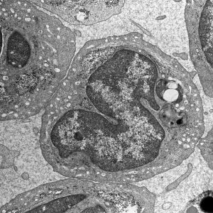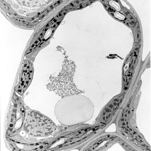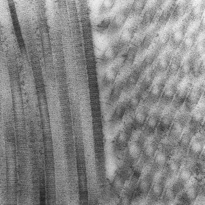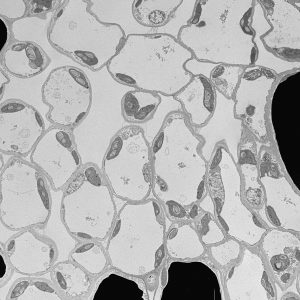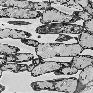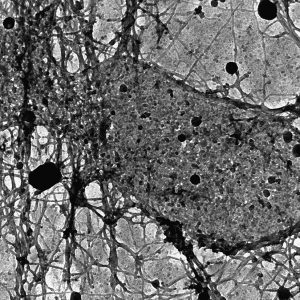 The micrographs in this exhibition were created on transmission electron microscopes (TEMs) where an electron beam passes through a very thin slice of the sample being examined. This gives a flat-looking image, rather like an aerial view of the sample. Where there are denser parts, the electron beam is blocked and a dark area is created on the image. Where there is less material, the beam goes through easily and shows up as a lighter area on the image. These images can only be captured in black and white as no visible light is involved in the imaging process.
